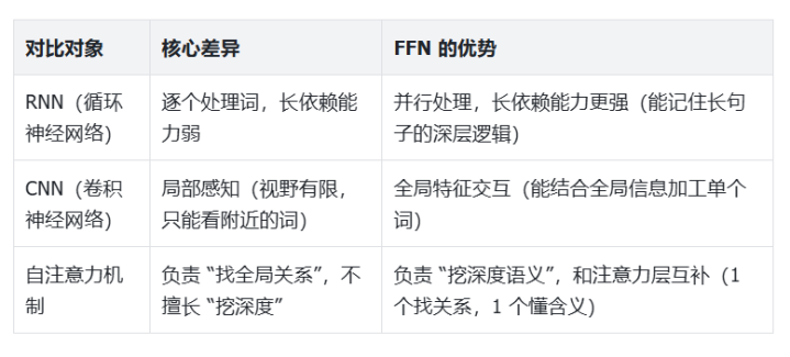 很多人会问:FFN和RNN、CNN、注意力层有什么区别?其实它们不是“替代关系”,而是“互补关系”,但FFN在关键场景下有不可替代的优势: