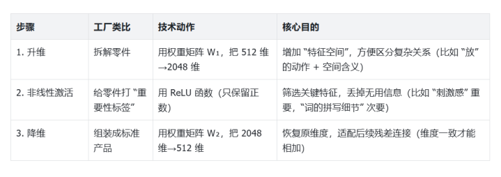 FFN的结构看似简单(升维→激活→降维),但每一步都有深意。我们可以把它比作一个“智能工厂”,专门加工“词向量(token)”: